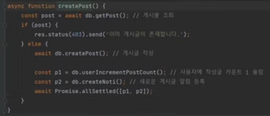 - 위처럼, await을 난발하기 보다는, 묶어서 처리할 수 있는 부분들은 묶어서 처리하는 것이 좋다! =>그리고 promise는 나중에 원할 때 언제든지 사용할 수 있는 장점이 존재하니 적극 활용을 해라!