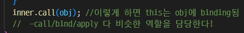 - 하지만 화살표 외에 다른 방식으로 선언하게 될 경우 inner() 함수의 this는 window를 지칭하게 된다!