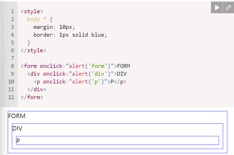- 위 사진에서 <p>태그 영역을 클릭하게 되면 p 태그에 할당된 헨들러만 동작되는 것이 아닌, div, form에 있는 핸들러들까지 순차적으로 작동하게 된다! => 이처럼, p는 가된 element에서 가장 최상단 요소까지 핸들러가 동작하게 되는 것이다.