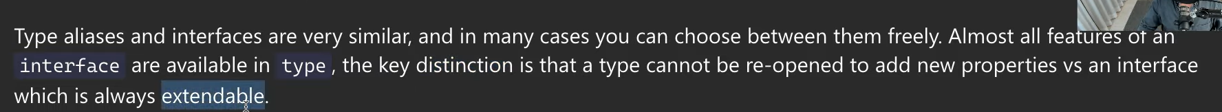 - 공식문서에 나와있는 해석을 보면, 둘이 거의 비슷비슷하지만, type은 새로운 property 추가가 안됨 =>따라서, 위에서 언급했듯이 interface에 비해 확장성이 떨어진다!