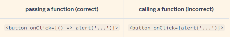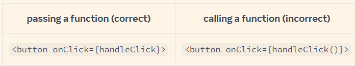 - 두 번째 예시는 ()는 함수를 호출하기 때문에 rendering되는 과정에서 click이 발생하지 않았음에도 불구하고 함수 호출이 발생한다.