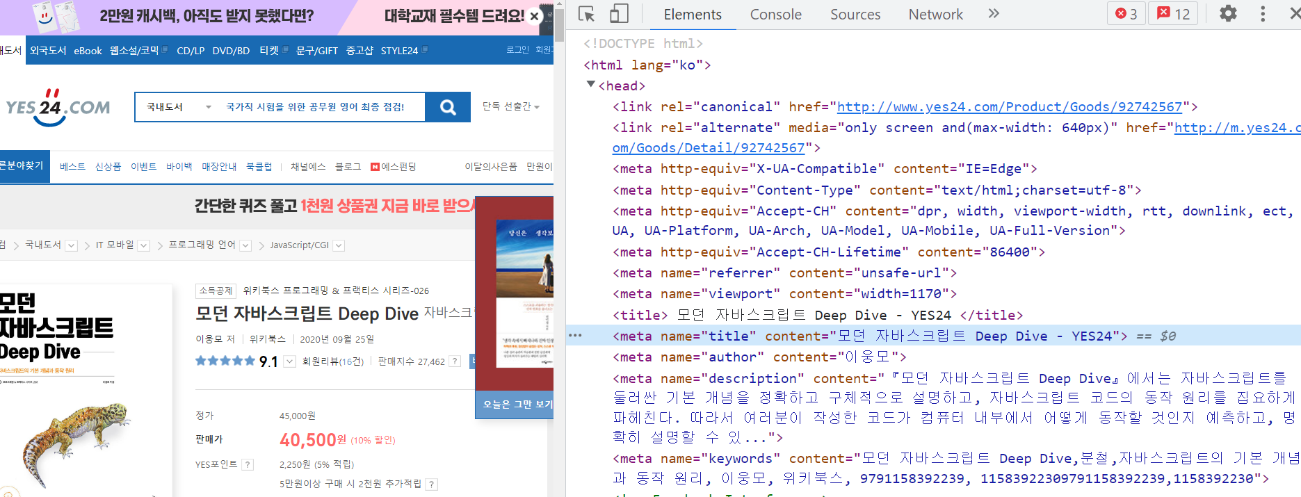 - 각 <meta> 요소와 <title> 요소에 '자바스크립트'와 'Deep Dive'가 들어가 있는 것을 확인할 수 있습니다. 이처럼, 웹 페이지에 사용되는 HTML 요소의 종류와 요소에 들어가는 내용도 검색 결과에 영향을 주고 있음을 확인할 수 있다. (수많은 요소 중 일부에 불과) 이 외에도 On-page SEO는 다양한 방법으로 검색 최적화를 실현하려고 한다.