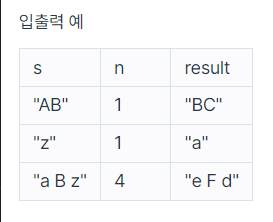 어떤 문장의 각 알파벳을 일정한 거리만큼 밀어서 다른 알파벳으로 바꾸는 암호화 방식을 시저 암호라고 합니다. 예를 들어 "AB"는 1만큼 밀면 "BC"가 되고, 3만큼 밀면 "DE"가 됩니다. "z"는 1만큼 밀면 "a"가 됩니다. 문자열 s와 거리 n을 입력받아 s를 n만큼 민 암호문을 만드는 함수, solution을 완성해 보세요.