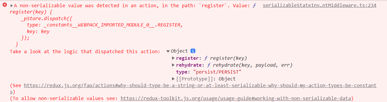redux-toolkit/redux의 경우 action에 직열화가 불가능한 데이터는 넣을 수 없다. 공식문서에 따르면 serializability dev check middleware 가 직렬화가 불가능한 데이터가 payload에 있을 경우 경고를 보낸다는 것! 위 에러는 바로 직렬화의 문제로 발생한 것이다. 문서에도 언급돼 있지만 redux-persist를 사용할 경우 위의 FLUSH 등과 같은 코드+middleware를 추가해줌으로써 dispatch 의 모든 action type을 무시해줘야 한다. 그러면 위 에러는 더 이상 뜨지 않게 된다.