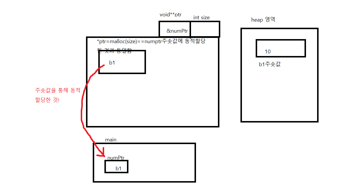 해당 코드를 살펴보면, 포인터의 주솟값을 (void**)&numptr 형식으로 넘겨주고, **ptr(이중포인터 변수)변수 선언을 통해 값을 받는 것을 확인할 수 있다. 즉, void **ptr에는 이전처럼 NULL을 인자로 받은 것이 아닌, 실질적인 *numPtr의 포인터 변수의 주솟값을 인자로 받은 것이다. 따라서, *ptr=malloc(size)는 실질적으로 밖에 있는 *numPtr에 동적할당의 주솟값을 입력하게 되고, 이는 함수가 종료되더라도, 실질적으로 *numPtr에 주솟값을 입력했기에 영향력이 지속되는 것이다!