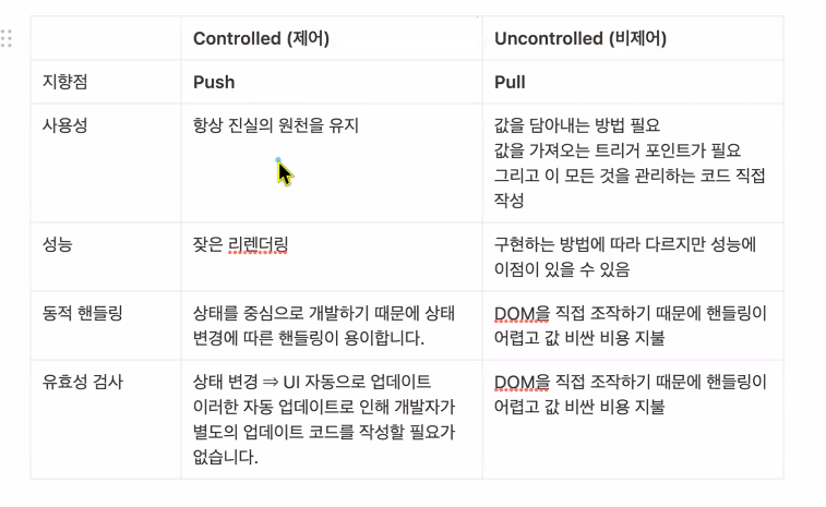 위 내용은 원티드 강의에서 제시된 제어/비제어 컴포넌트의 장단점을 담고 있다. 비제어 컴포넌트는 정말 특수한 경우를 제외하고 사용이 제한되는 것처럼 보인다.