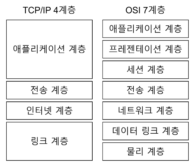 TCP/IP 계층은 네 개의 계층을 가지고 있으며, OSI 7계층과 많이 비교 된다.