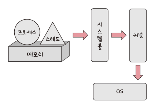 위 그림처럼 프로세스나 스레드에서 운영체제로 어떠한 요청을 할 때 시스템콜이라는 인터페이스와 커널을 거쳐서 가게 된다.