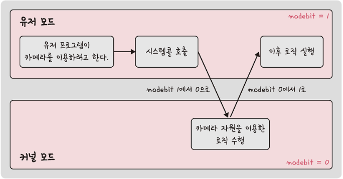 시스템콜이 작동될 때 modebit을 참고해서 유저 모드와 커널 모드를 구분한다. modebit은 1 또는 0의 값을 가지는 플래그 변수이다. 카메라, 키도드 등 I/O 디바이스는 운영체제를 통해서만 작동해야 한다.