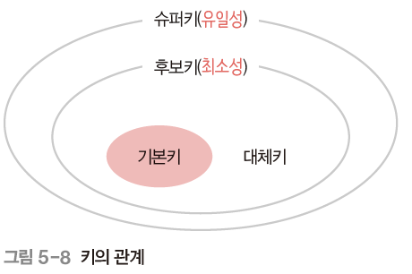 키들은 위의 그림과 같은 관계를 가진다. 후보키 중에 기본키로 선택되지 못한 키는 대체키가 된다. 유일성은 중복되는 값은 없으며, 최소성은 필드를 조합하지 않고 최소 필드만 써서 키를 형성할 수 있는 것을 말한다.