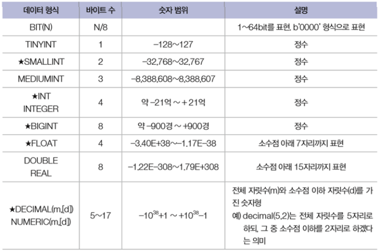 숫자 타입으로는 TINYINT, SMALLINT, MEDIUMINT,INT DIGINT 등이 있다.