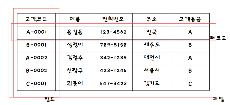 고객이란 엔터티는 속성으로 이름, 전번, 주소, 고객 등급 등의 필드를 가진다. row(행) 단위의 테이터를 record라고 하며, 이를 튜플이라고도 한다.