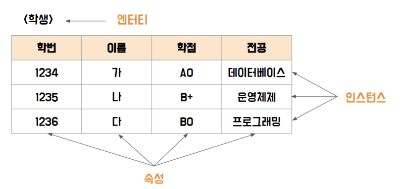 위 그림처럼 학생이라는 entity가 있으면 학생은 학번, 이름, 학점 등의 속성을 가지게 된다. 더 다양한 속성이 존재하겠지만 서비스의 요구 사항에 따라 맞춰진다.(보통 서비스 요구사항과 무관한 속성을 사라진다)