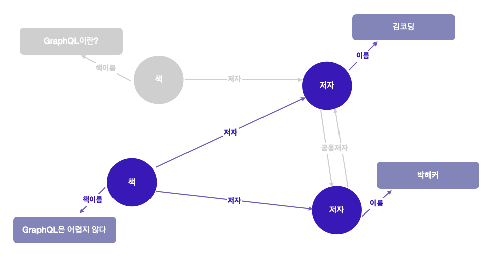 ISBN 번호를 사용하여 선택한 “책" 노드에서 시작한다. 그 다음 graphQl은 중첩된 각 필드로 표시된 간선을 따라 그래프를 탐색하기 시작한다. 쿼리 내 중첩된 "책 이름" 필드를 통해 책의 제목이 있는 노드로 이동을 한다. "저자"로 레이블이 지정된 "책"의 간선을 따라 "저자" 노드를 가져오고, 각 저자의 이름을 얻어오는 것이다.