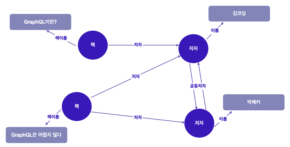하나의 도서 목록에는 많은 책과 저자가 있으며, 각 책에는 최소한 한 명의 저자가 있다. 또한, 최소한 한 권의 책을 같이쓴 공동저자도 있을 것이다. 이러한 상황을 그래프로 표현하면 위와 같을 것이다. 데이터 조각들이나 나태내고자 하는 엔티티(책, 혹은 저자) 간의 관계를 나타낼 수 있게 된다.