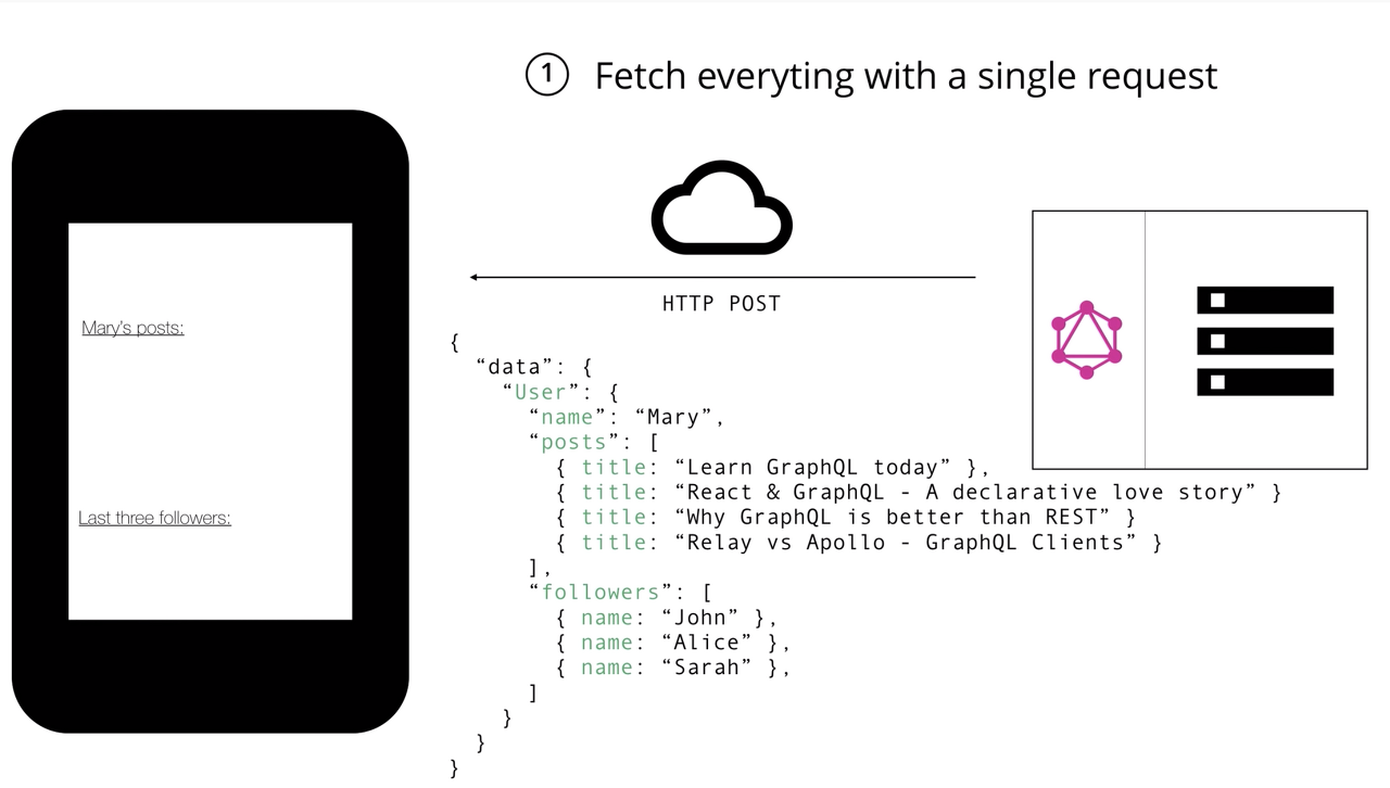- 클라이언트 구조가 바뀌어도 필요한 데이터를 결정하고 받는 주체가 클라이언트이기 때문에 서버에 지장이 없다. 클라이언트에서는 무슨 데이터가 필요한 지에 대해 요구사항을 쿼리로 작성하면 된다.