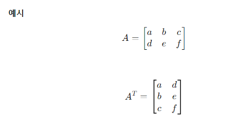 transpose는 행과열을 뒤바꾸는 것을 의미한다.행렬 A의 전치 행렬은 A^T 로 표시한다.